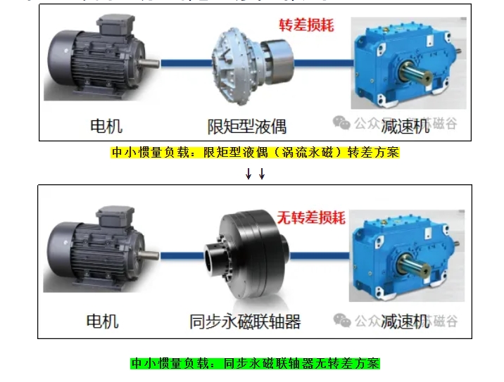 風機水泵平方轉矩類用液力偶合器或渦流永磁調速器調速,電機功率1000kW,調速比i=80%,轉差損耗功率= (80%^2 - 80%^3)*1000 = 63.5kW;按年工作8000小時,電費0.6元/度計算,年耗電費=63.5*8000*0.6=304800(元) 據估算,(1) 用于緩沖沖擊保護配套有阻尼類緩沖液力偶合器每年轉差損耗為478億千瓦時;(2) 用于風機、水泵負載轉差調速過程每年產生的轉差損耗為560億千瓦時;合計轉差損耗478+560=1038億千瓦時,占比2022年中國工業領域電機總用電量3.98萬億千瓦時2.68%。相當三峽發電全年的發電總量。 【解決緩沖轉差損耗策略1】 中小轉動慣量負載優先采用無轉差彈性緩沖方式啟動和運行。